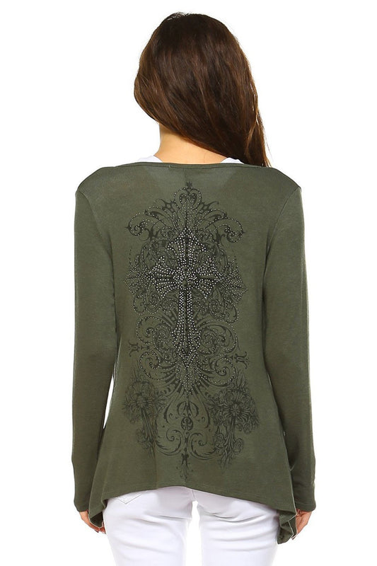 Hunter Green Long Sleeve A-line Knit Cardigan/Cross Tattoo Scroll style Back