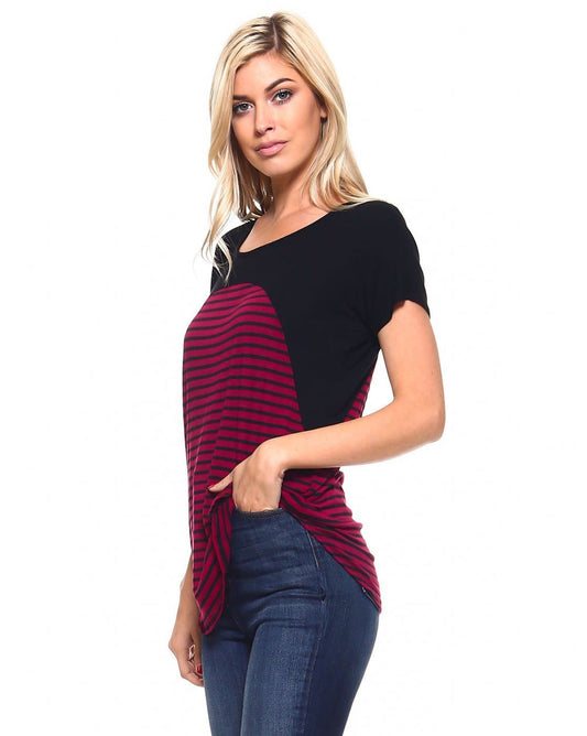 Striped Scoop neck Short Sleeve Casual Chiffon Top With Upper Mesh Lining