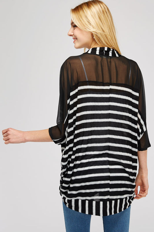 Light And Breezy Black and White Stripe Hi/Low Ballon Wrap Cardigan With Dalgon Sleeve
