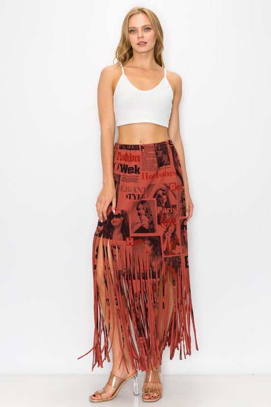 Sublimation Magazine Printed Elastic Waist Fringe Skirt