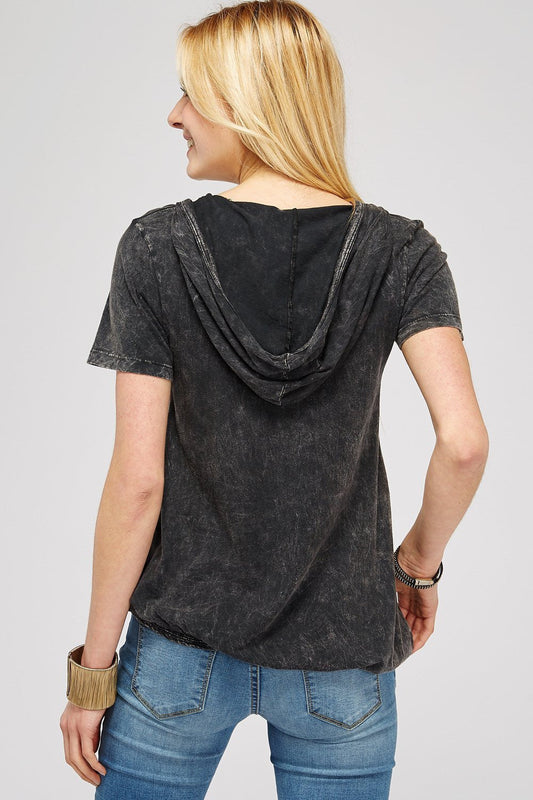 Black Mineral Washed V-Neck Short Sleeve With oyalty Angel Wings