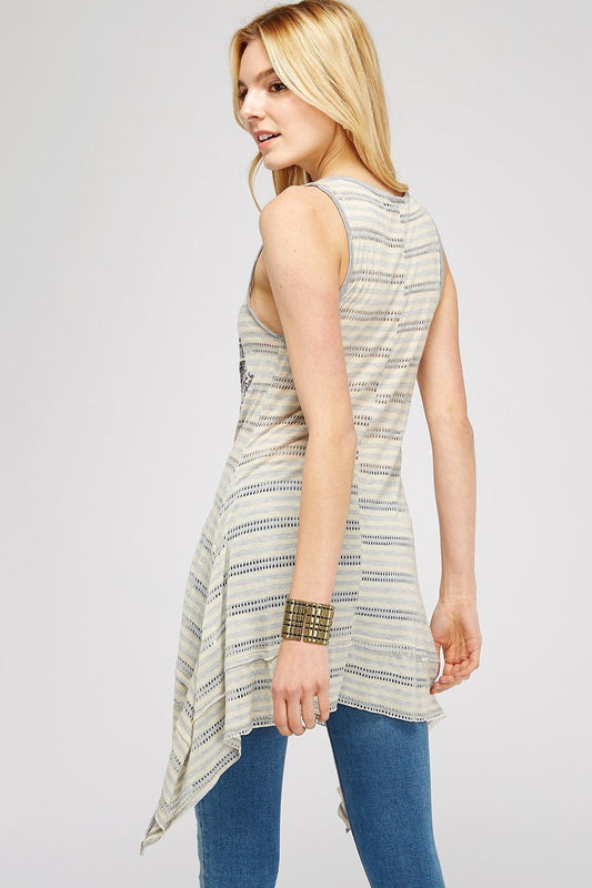 Women Tops - Grey U-neck Perforated Two Tone Stripe Tunic Tank Top
