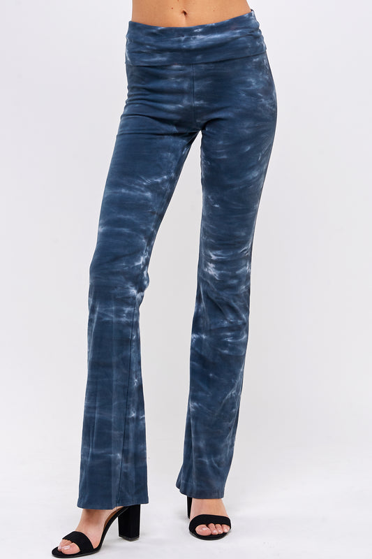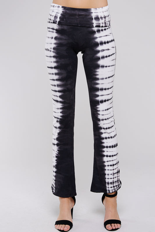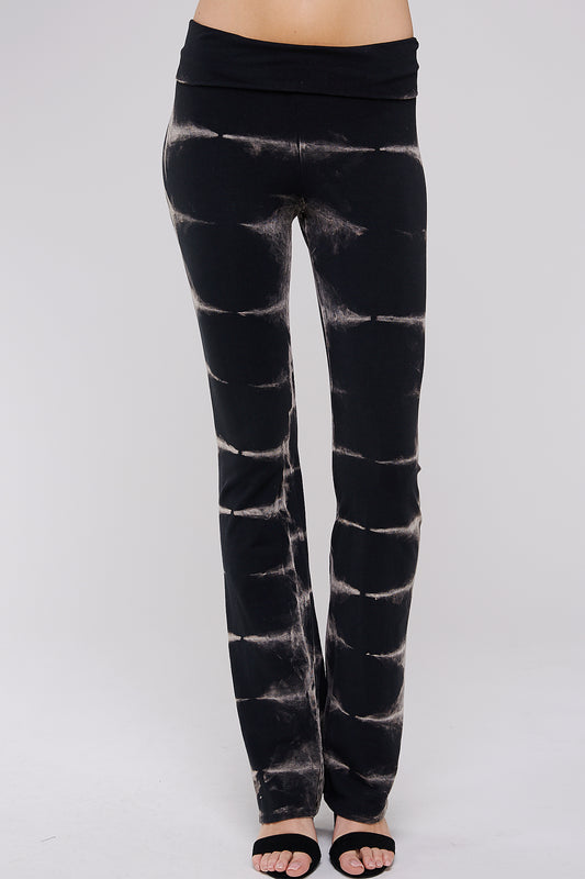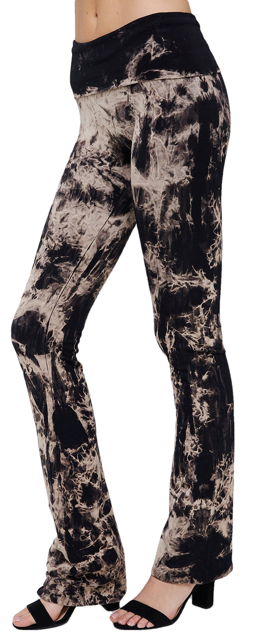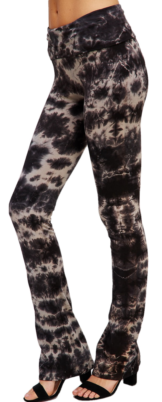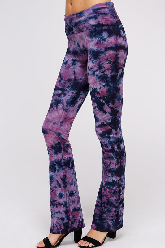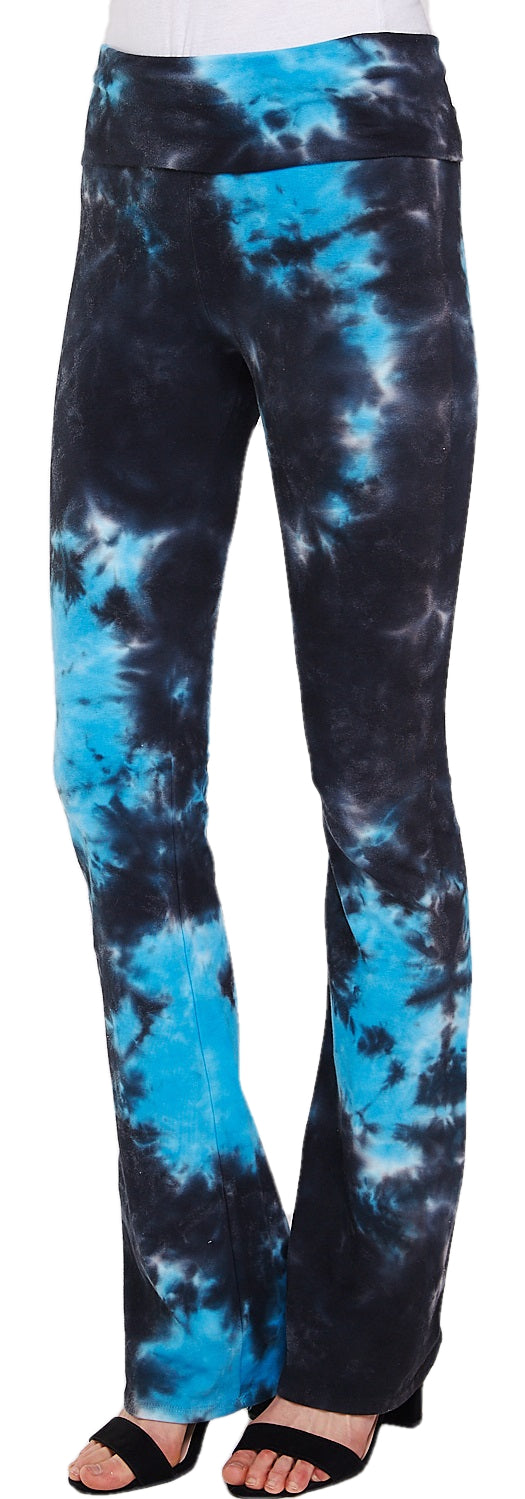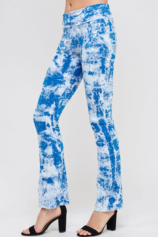 Tie Dye Print Yoga Pants - Women's Casual Fold Over Waistband Flared Leg Stretch